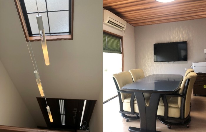 玄関吹き抜けにスリムな円柱状のLEDシャンデリア。テレビを壁掛けにして窓廻りも広々、プリーツスクリーンをつけておしゃれプラス自然採光